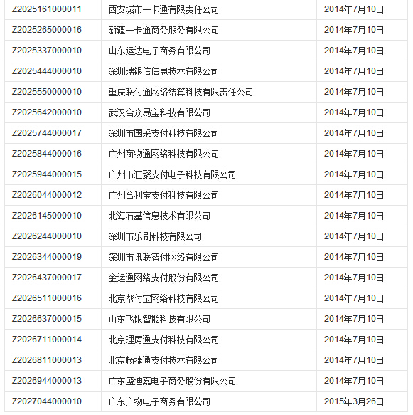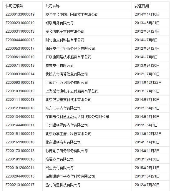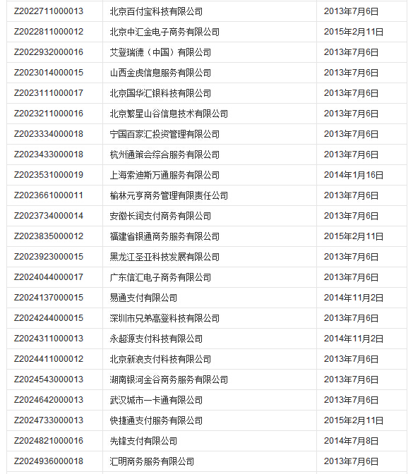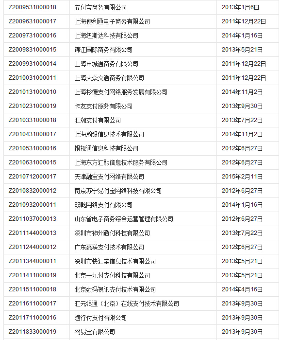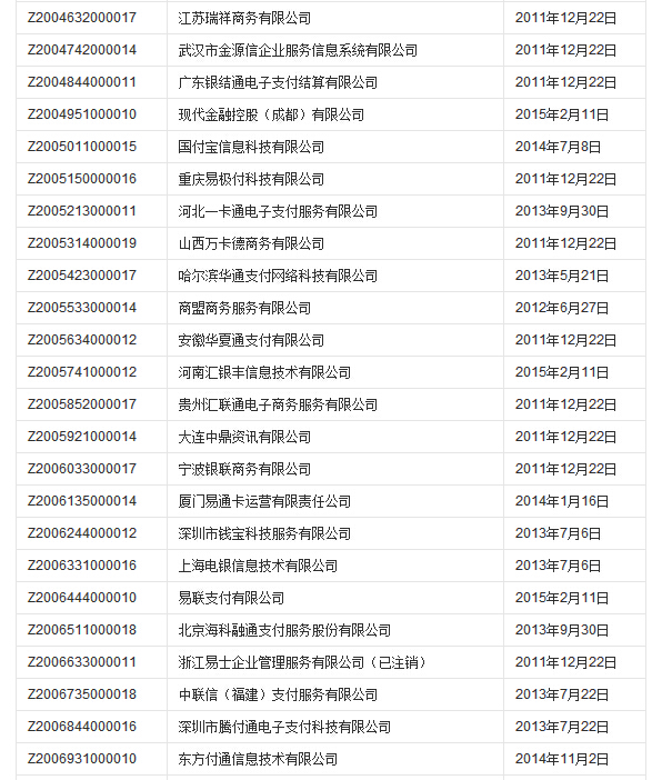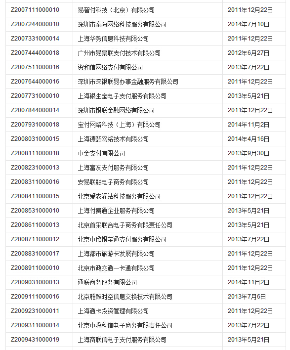 支付业务许可证获批单位