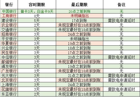 不过每个银行的宽限期限也大不相同,大多数银行是自然日3天,比如中行、招商银行等提供的还款宽限期限为3天。还有一些其他常见银行的宽限期限以表格列出。
