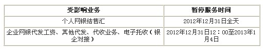 为了给您提供更加优质的服务,我行将于2012年12月31日进行系统升级,届时将暂停部分网银服务。具体受影响业务如下: