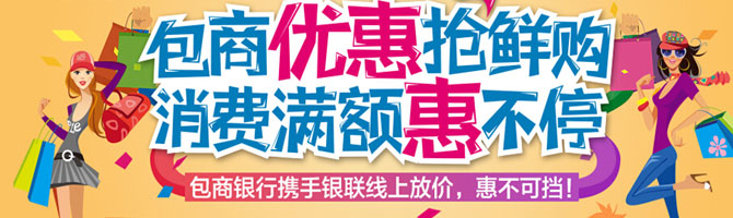 活动内容:持包商银行信用卡通过银联在线支付,可享满50立减10元优惠,活动每天限前200名客户参与,每位客户每日享受1次、单月限享受4次立减10元优惠