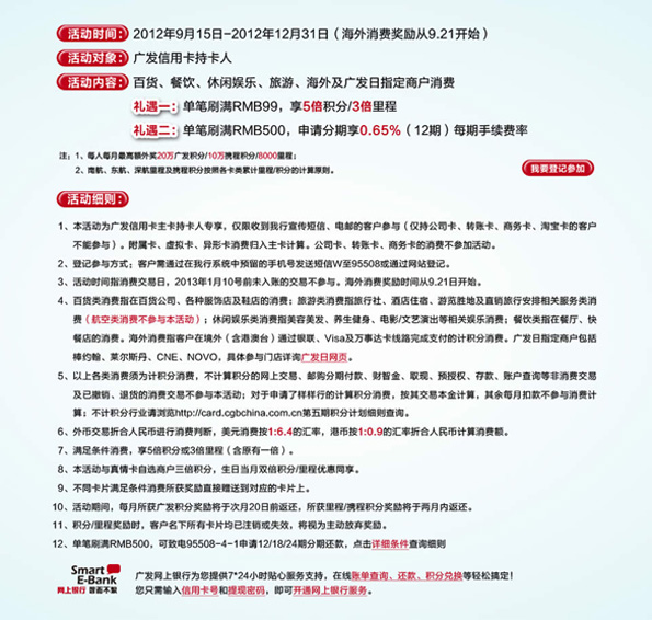 活动时间:2012年9月21日-2012年12月31日活动主题:[其他]广发银行信用卡CNE享买一送一优惠