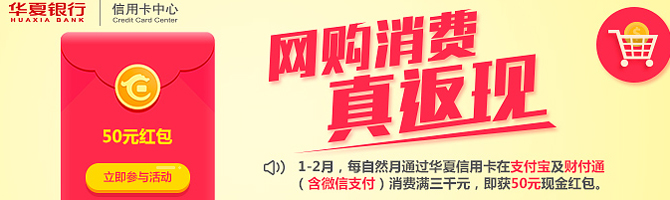 活动内容:活动期间,每自然月通过华夏信用卡在支付宝或财付通(含微信支付)消费满3000元,即获50元现金红包。每月仅可获赠一次50元现金红包。