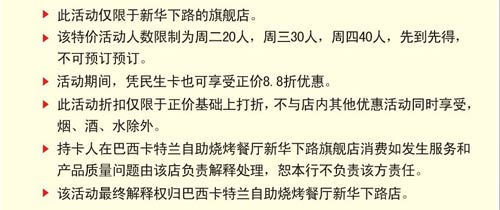 活动时间:即日起到2012年4月30日 活动主题:[武汉]民生银行信用卡巴西卡特兰自助烧烤特惠活动
