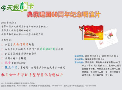 活动时间:即日起至2009年9月30日,深圳发展银行今天我靓卡,典藏建国60周年纪念明信片