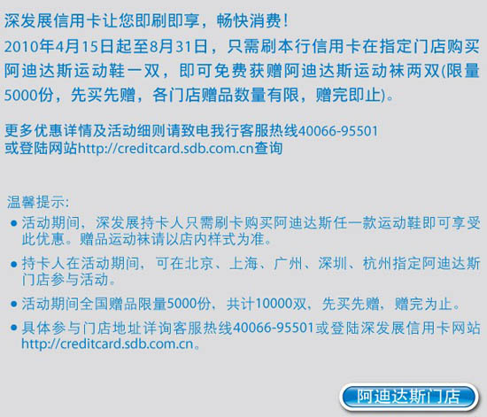 活动时间:即日起至2010年8月31日,[深发卡][爽吧爽吧!阿迪达斯运动袜穿回家