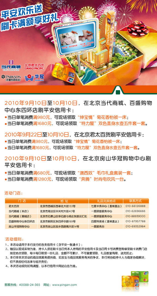 活动时间:即日起至2010年10月10日,[北京]平安信用卡 刷卡满额享好礼