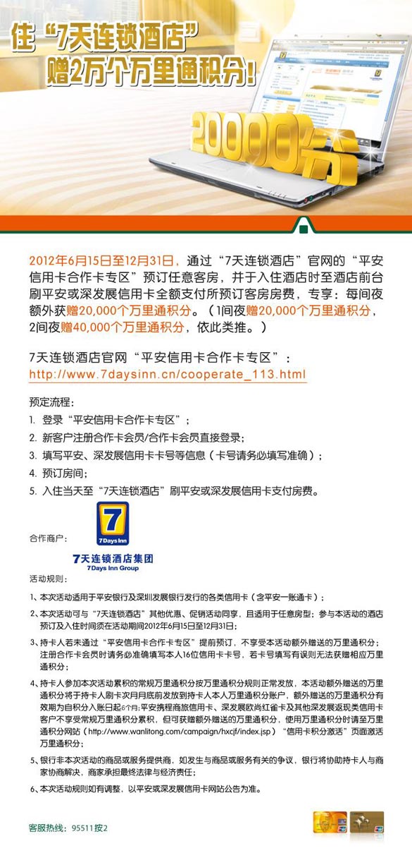活动时间:即日起至2012年12月31日活动主题:[上海] 住“7天连锁酒店”,赠2万个万里通积分!