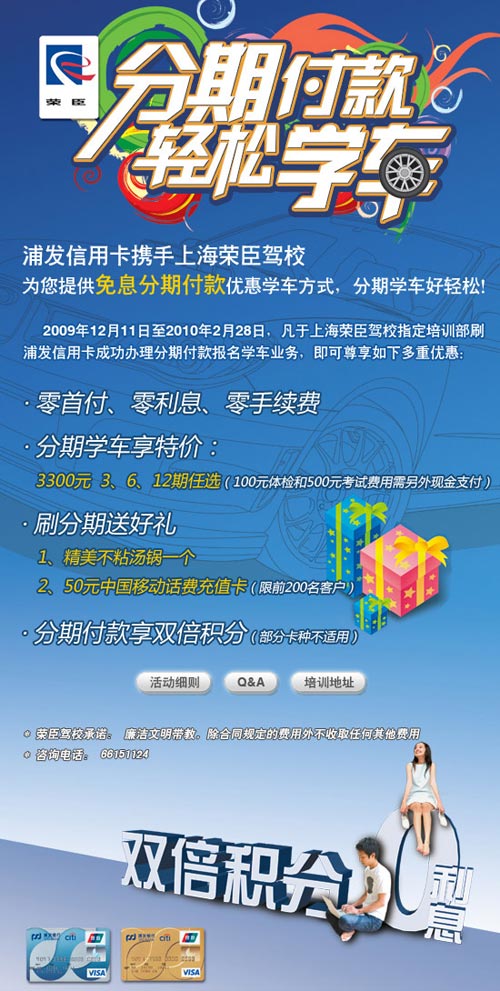 1、 本次活动时间为2009年12月11日至2010年2月28日。上海荣臣驾校指定培训部地址详见浦发信用卡中心网站。