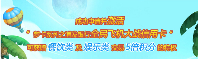 活动内容:成功申请并激活“梦卡系列之浦发银行全民飞机大战信用卡”可获赠餐饮类及娱乐类交易5倍积分的特权