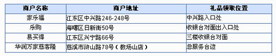 活动时间:2010年7月12日至10月24日,礼品领取时间为2010年7月12日至10月24日期间的每周六、周日。 活动内容:活动期间,持兴业银行信用卡于境内刷卡消费满3笔,且每笔金额满288元,即可在指定时间凭信用卡及签购单到指定地点领取蒙牛真特仑苏牛奶1箱,让您品味特仑苏人生。 礼品领取:宁波地区4家大型超市(见下表) 活动细则: 1、交易时间以签购单上打印时间为准;礼品领取时间为2010年7月12日至2010年10月24日期间的每周六、周日10:00-20:00,每卡每日限领1箱,每卡每月限领2箱,每位客户每月限领10箱。 2、参加活动的任意2笔刷卡消费不得为同一日且为同一商户的交易;领取过本活动礼品的交易不再重复参加同期开展的其它兴业银行信用卡活动。 3、领取礼品需凭本人兴业银行信用卡及符合活动条件的签购单原件至指定地点领取,信用卡卡号及签购单上的卡号须一致且为同一张卡,主附卡交易不合并计算。 4、领取礼品后工作人员将收回签购单原件,对于无法提供或拒绝交回签购单原件的将不提供领取礼品的机会。 5、如持卡人获赠礼品后发生退货导致不符合活动受赠礼品条件,以及以同笔交易重复参与活动的,兴业银行将按本次活动礼品当地市场价格从持卡人信用卡账户扣除相应款项。 6、取现交易、网上交易、境外交易(包含港、澳、台交易)、预授权交易以及部分类型商户的交易不可参加本活动,不提供领取礼品的机会。不能参加本活动的商户类型详见本行网站公布的《不参加活动商户类型一览表》,商户类型可通过签购单上“商户编号”的第8位至第11位进行识别。 7、本活动礼品为蒙牛特仑苏纯奶,规格为每箱12盒,每盒250ml。兴业银行信用卡中心保留更换同等价值礼品的权利;获赠礼品不可兑换现金,所获赠礼品的个人所得税由持卡人自理。 8、本活动礼品均由生产商或供应商直接提供,相关的礼品质量及服务事宜以及由此产生的法律责任,均由生产商或供应商负责,兴业银行不承担任何法律责任。 9、在法律允许的范围内,兴业银行保留对本次活动条款进行解释的权利,并有权根据情况取消本活动或增删、修订本规则(包括但不限于礼品领取地点、领取时间及赠礼标准等),并于网站、账单、语音电话等媒体或银行网点公告后生效。